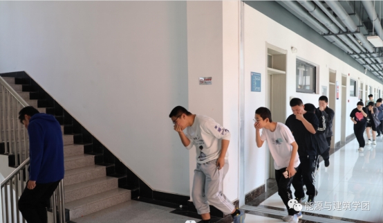 随后,演练进入了自救环节。学生们排队逃离教室,并按照王海金院长的指示,采取正确的步骤和方法逃离楼房。在紧张的演练中,同学们相互帮助、互相激励。
