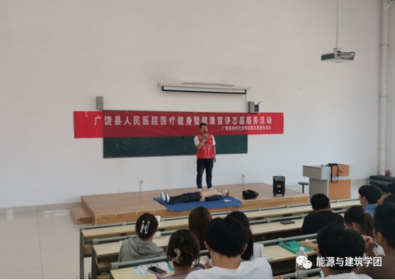 讲座开始首先由武军主治医师利用ppt给同学们讲解了危重病、创伤、意外伤现场急救、异物进入体内、鼻出血、中暑、溺水、癫痫发作、初级心肺复苏术,重点讲解了“心肺复苏”“海姆立克急救法”的相关理论知识。