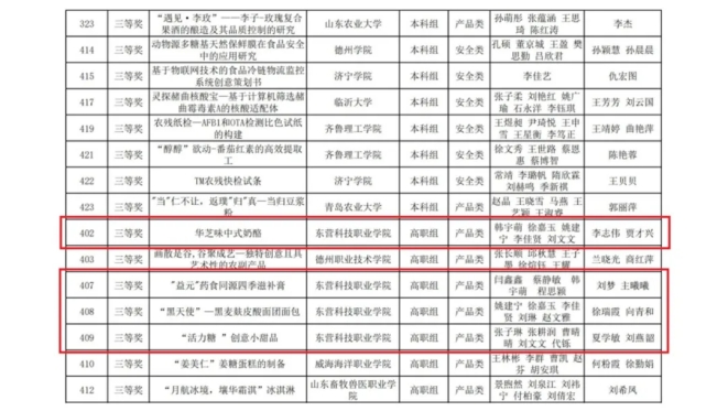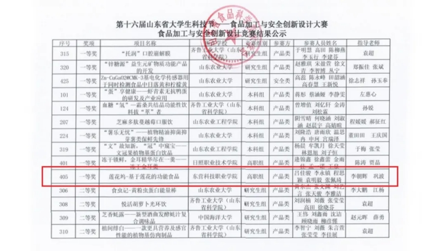 近日,第十六届山东省大学生科技节——食品加工与安全创新设计大赛成绩公布。我校参赛团队以卓越的创新能力和扎实的专业素养,从决赛100支队伍中脱颖而出,最终获高职组一等奖1项,二等奖1项、三等奖4项的好成绩。