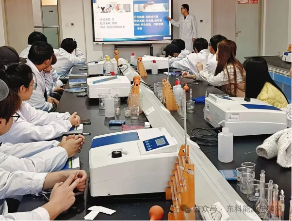 近日,徐霁老师在《仪器分析》课程中开展紫外可见分光光度法测微量铁实验教学。课堂上,他结合实验原理,细致拆解紫外可见分光光度计的构造、分光装置工作原理及操作规范,重点强调实验关键注意事项。随后,通过现场示范操作流程,徐霁老师指导学生分组实操,从仪器调试、试剂配制到数据读取全程跟进,耐心解答学生疑问,引导学生实现理论知识向实操技能的转化,充分彰显了扎实的专业功底与务实的教学作风。