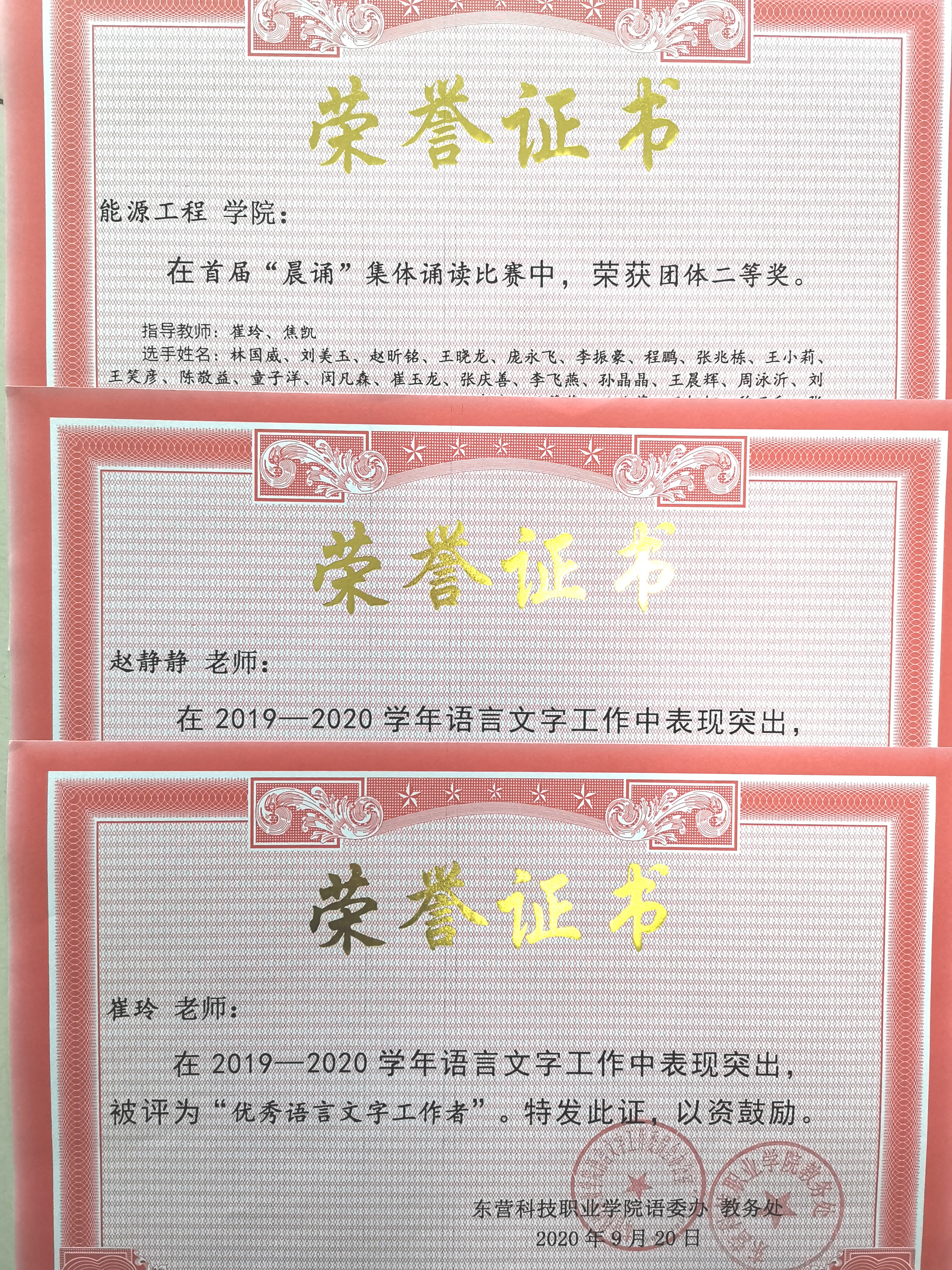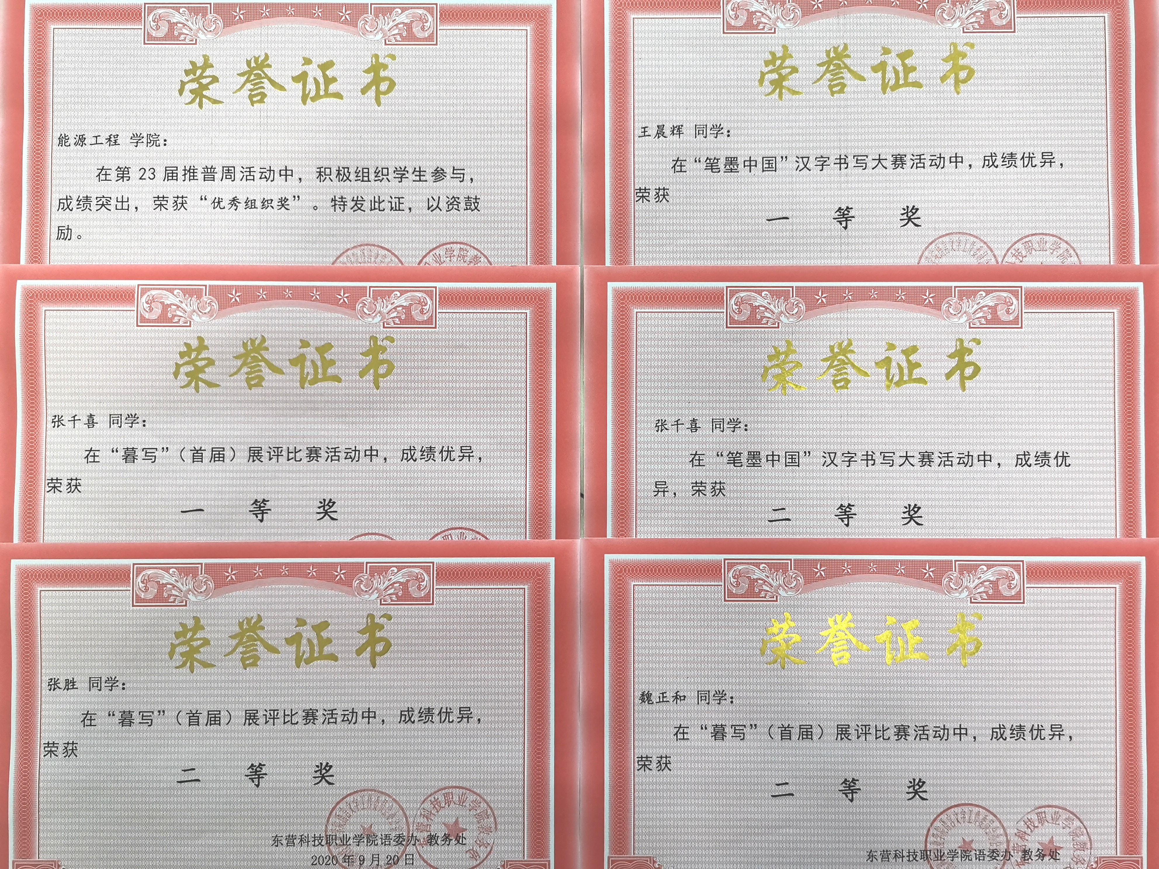 在各项比赛中,学院领导高度重视,指导教师认真负责,学生们积极配合,最终我院学生在各项比赛中脱颖而出,以王晨辉、张千喜等为代表得同学获得各项荣誉。我院语言文字工作表现突出,赵静静、崔玲老师获得“优秀语言文字工作者”称号,能源工程学院荣获“优秀组织奖”。