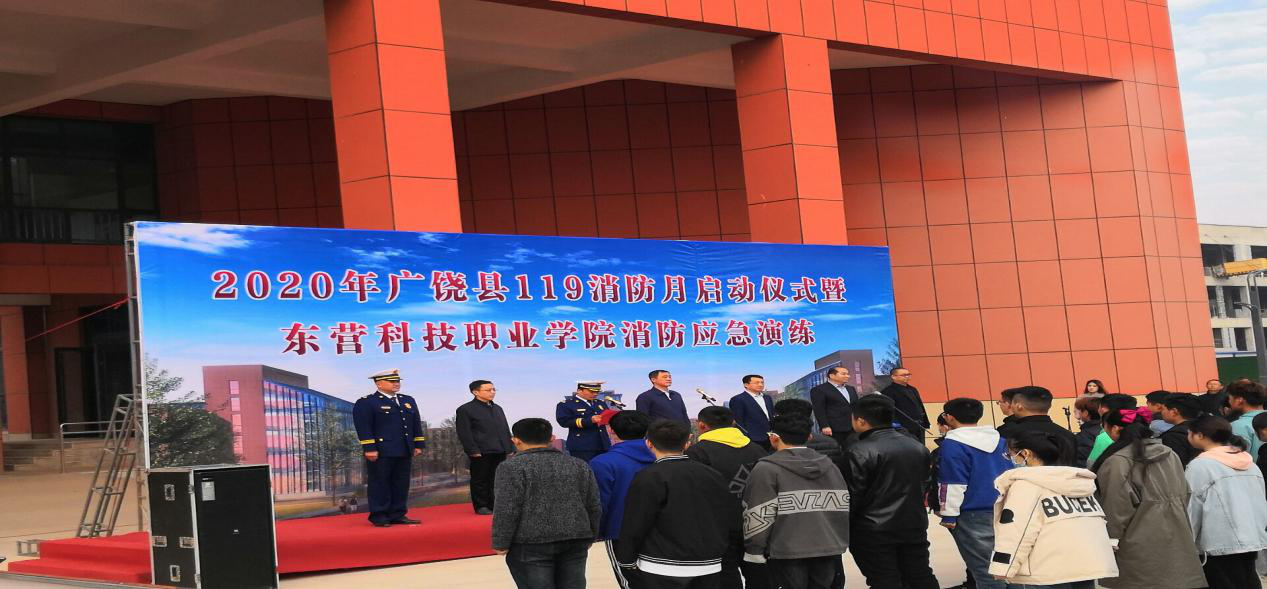 11月12日上午,广饶县“119”消防月启动仪式暨我校消防应急演练在广饶校区隆重举行。广饶县政府副县长、公安局局长杨秀林,应急管理局局长成京杰,消防大队大队长任冠军,消防大队教导员吴兴滨,校长成永江,纪委书记宋惠中等领导出席。随后,进行了消防演练和消防器材展示,相关部门负责人及师生代表500余人参加了演练。