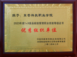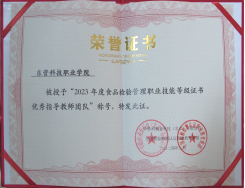 近期,为深入贯彻《国家职业教育改革实施方案》,扎实稳步落实好1+X证书制度试点工作有关政策及要求,教育部1+X食品检验管理职业技能等级证书的评价机构—中检科教育科技(北京)有限公司组织召开2023年度表彰大会,我校荣获2023年度1+X食品检验管理职业技能等级证书“优秀组织单位”称号,食品专业团队老师荣获“优秀指导教师团队”称号。