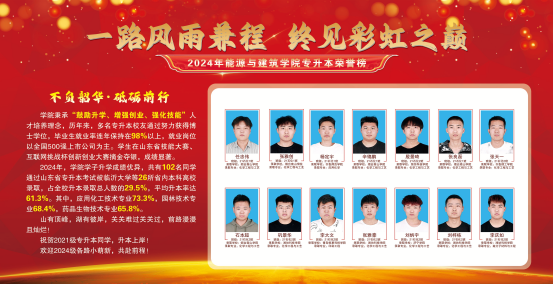 2024年,学院学子升学成绩优异,共有102名同学通过山东省专升本考试被临沂大学等26所省内本科高校录取,占全校升本录取总人数的29.5%,平均升本率达61.3%。其中,应用化工技术专业73.3%,园林技术专业68.4%,药品生物技术专业65.8%;山有顶峰,湖有彼岸,关关难过关关过,前路漫漫且灿烂!