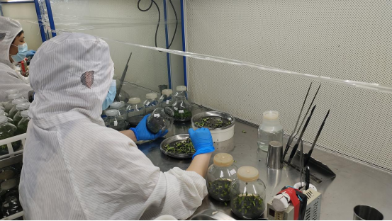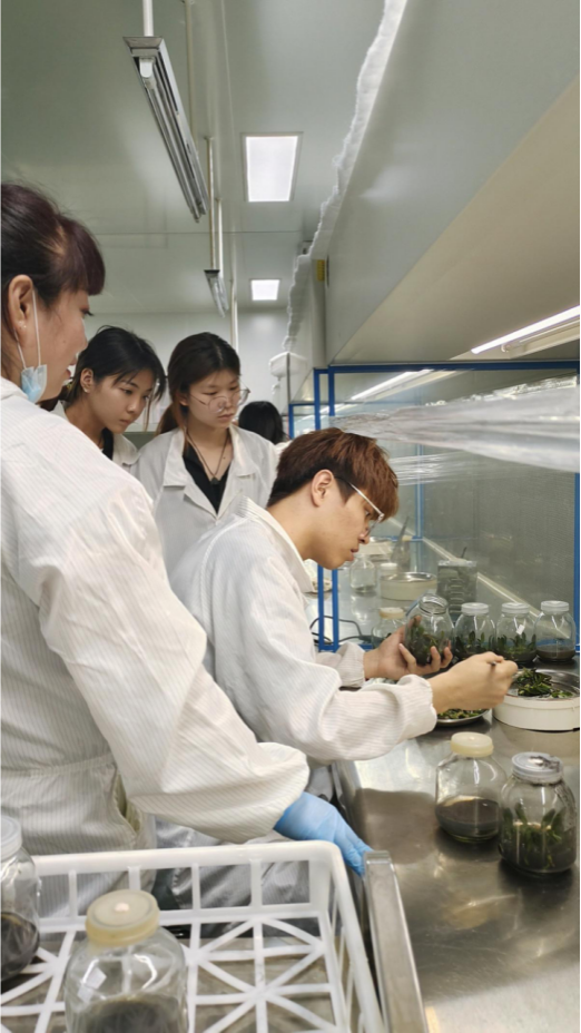 实训核心环节由企业技术主管凌思艳携3名资深组长全程指导。学生以小组为单位,深度参与外植体采集、无菌接种等关键工序。为保障蝴蝶兰组培苗的生长活性,操作全程执行严苛的无菌标准:采集阶段需精准控制底叶切除角度与根部修剪长度,接种环节则对植入位置、深度误差设置毫米级操作规范。这种"手把手"的实战教学,让理论知识与产业需求实现精准对接。