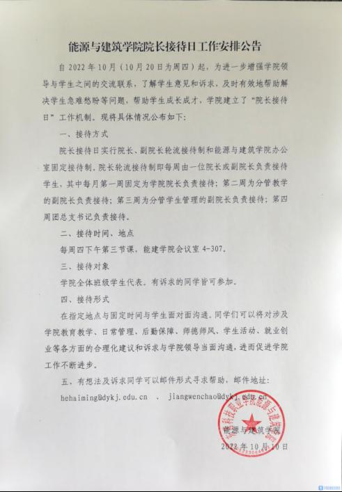 自2022年10月(10月20日为周四)起,为进一步增强学院领导与学生之间的交流联系,了解学生意见和诉求,及时有效地帮助解决学生急难愁盼等问题,帮助学生成长成才,学院建立了“院长接待日”工作机制。现将具体情况公布如下:
